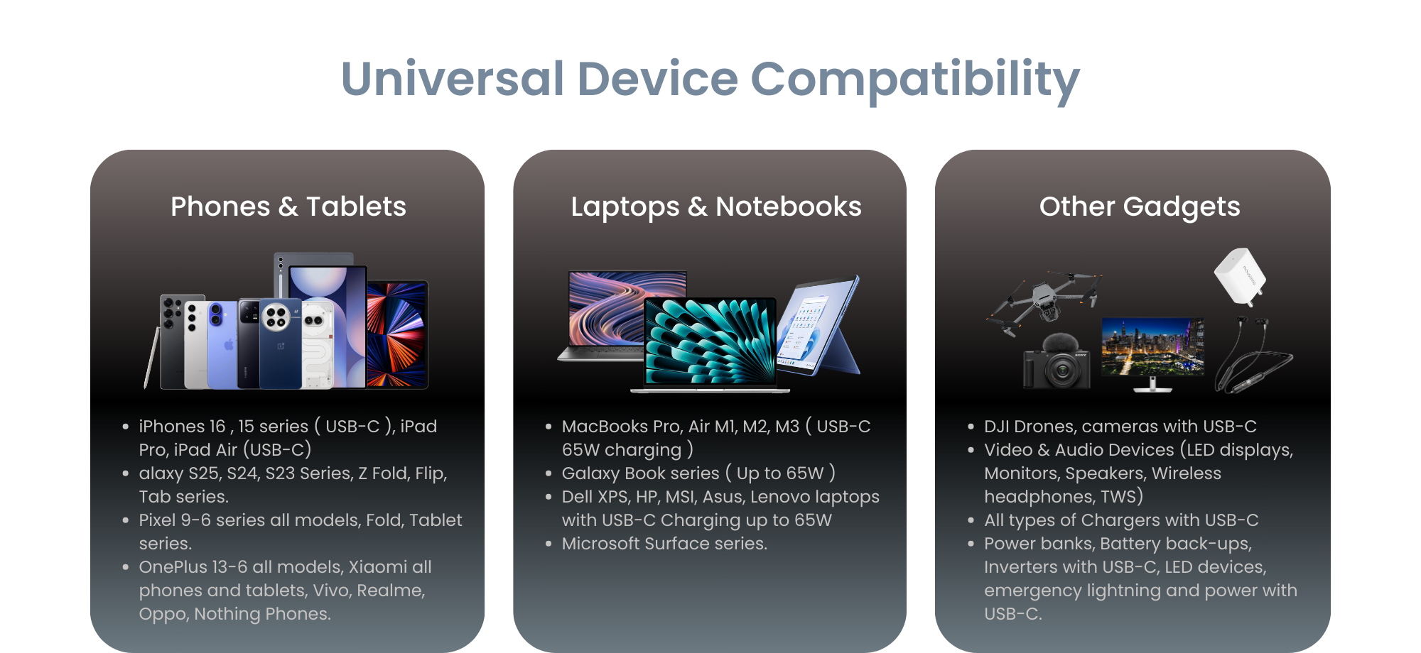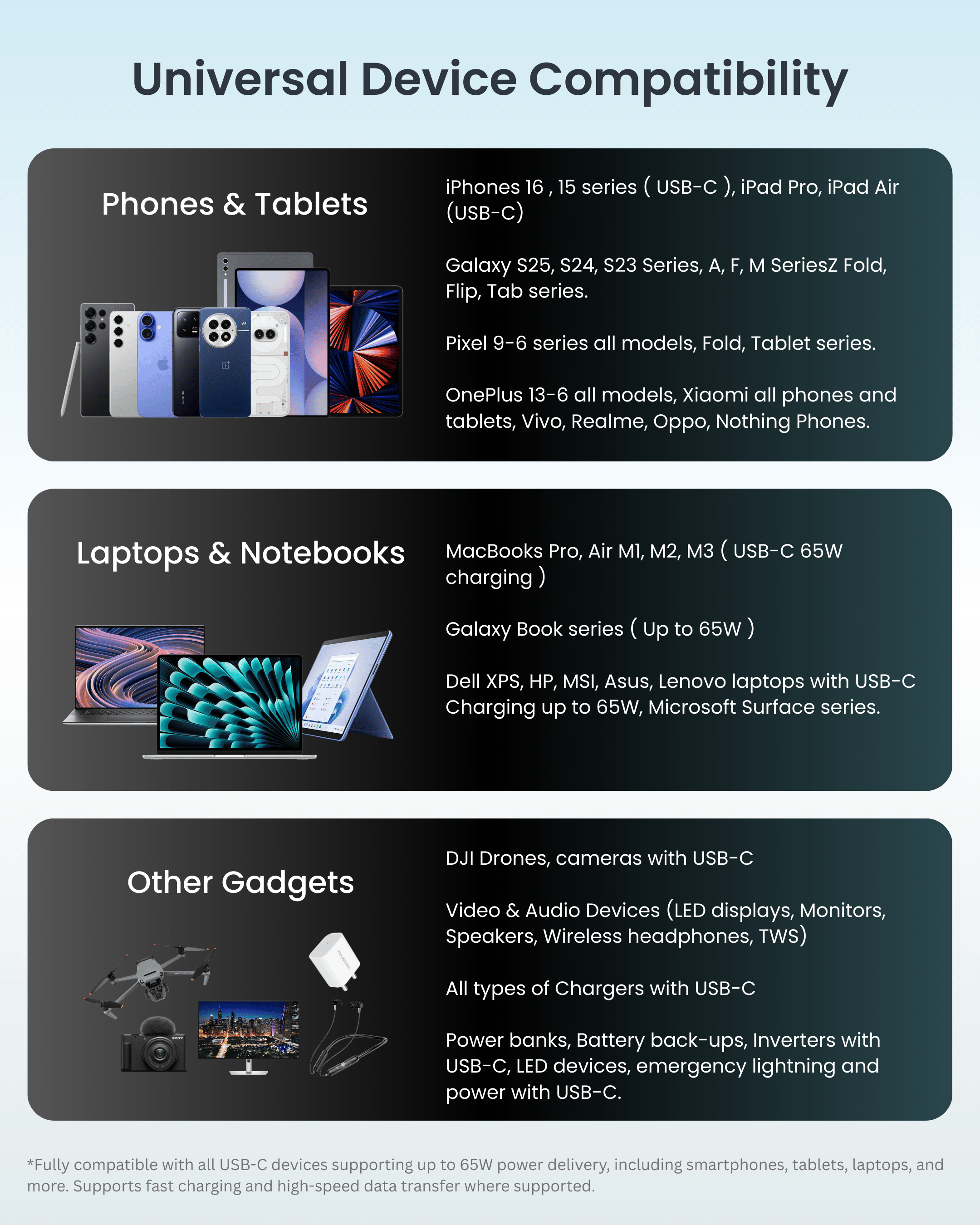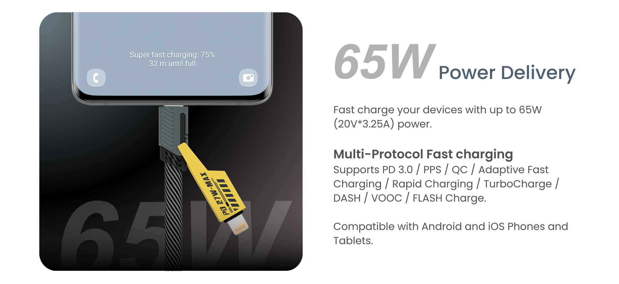 Yes! It delivers up to 65W (20V–3.25A) and supports fast-charging protocols like PD, PPS, QC, Adaptive Fast Charging, and TurboCharge, perfect for phones and laptops.