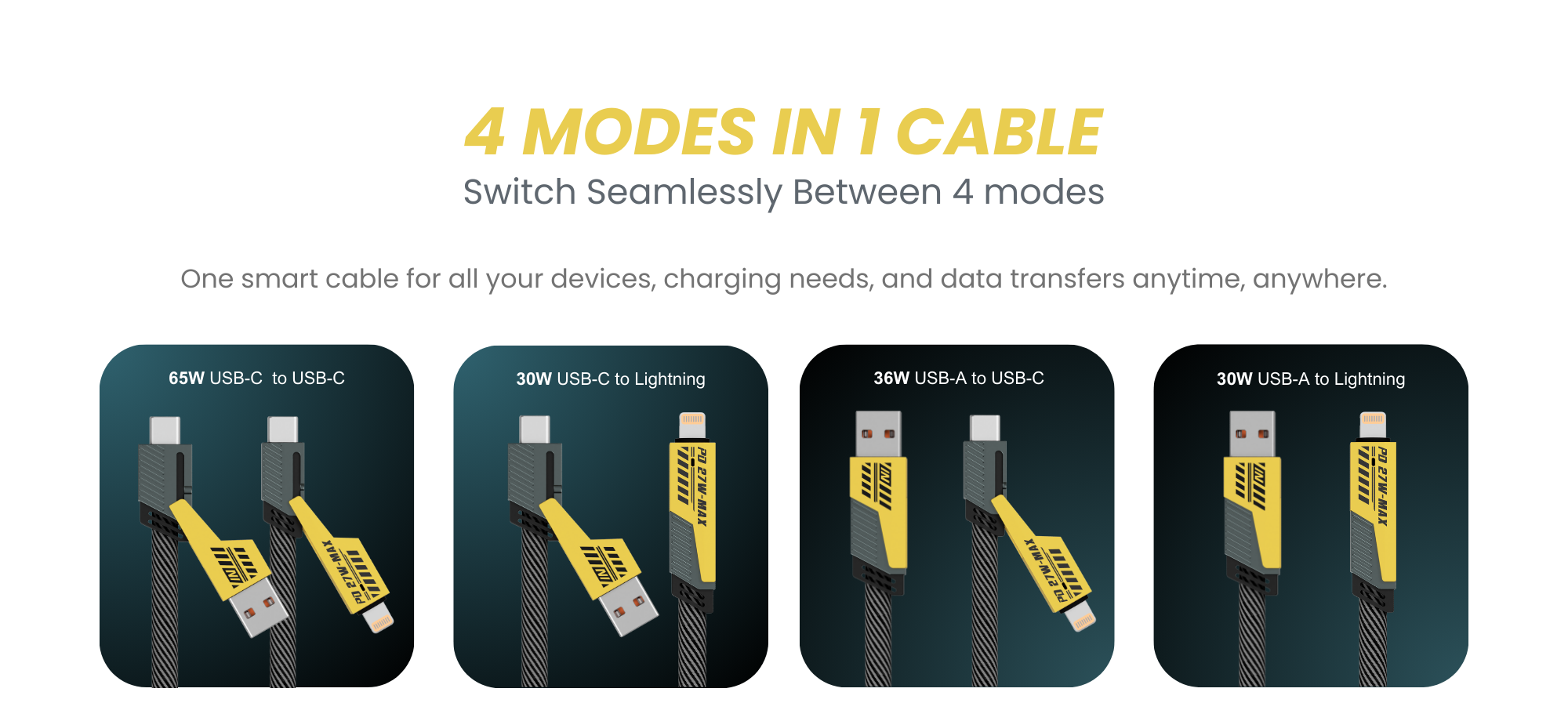 Velocity 65W MAX4 is your 4 IN 1 powerhouse for fast charging and data transfer. Engineered to seamlessly switch between USB-C to USB-C, USB-C to Lightning, USB-A to USB-C, and USB-A to Lightning. Whether you’re powering up your smartphone, tablet, or laptop, MAX4 keeps you connected with one reliable, compact solution.