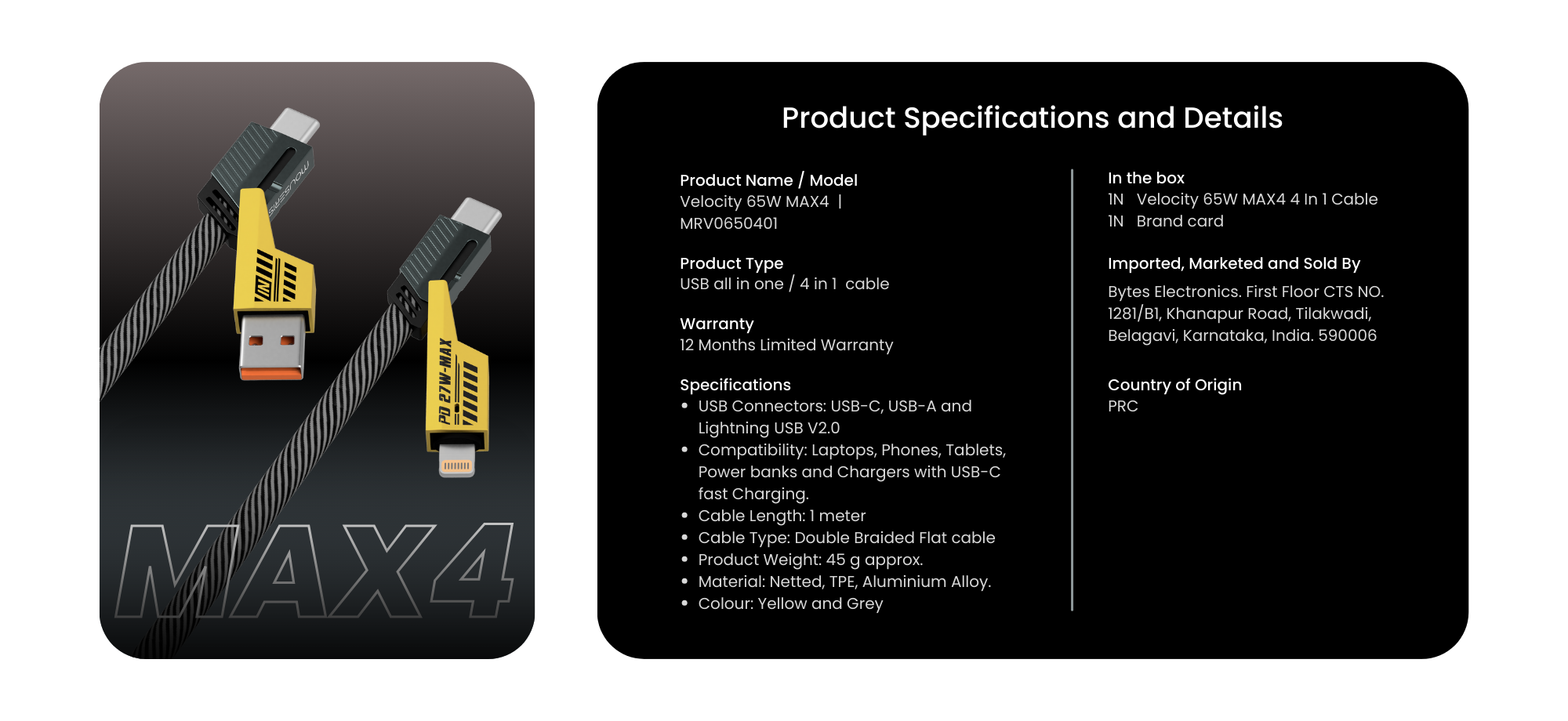 Velocity MAX4 65W 4 In 1 Braided Cable